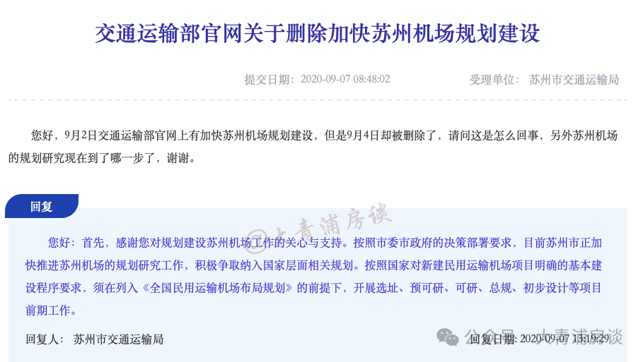 我们梳理发现,2020年9月,有市民反映,当年9月2日交通运输部官网上有加快苏州机场规划建设,但是9月4日却被删除了,请问这是怎么回事,另外苏州机场的规划研究现在到了哪一步了。
