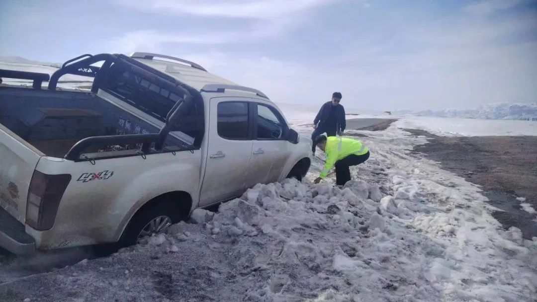 近日,新源县公安局交警大队景区派出所驻所交警中队民警接到群众求助,称其车辆在那拉提景区空中草原路段陷入路基旁的雪堆里,由于积雪太厚,车辆无法驶上公路,请民警救援。