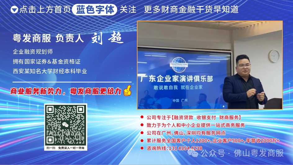 本人专业从事银行贷款5年,名下创办【粤发富贵(佛山)商务服务有限公司】。熟悉广佛两大城市大部分银行/金融机构融资贷款产品,有融资贷款/企业融资/收银支付/信用卡/财商咨询/债务重组与优化等相关问题,欢迎免费咨询,我一定给你客观中肯的建议。
