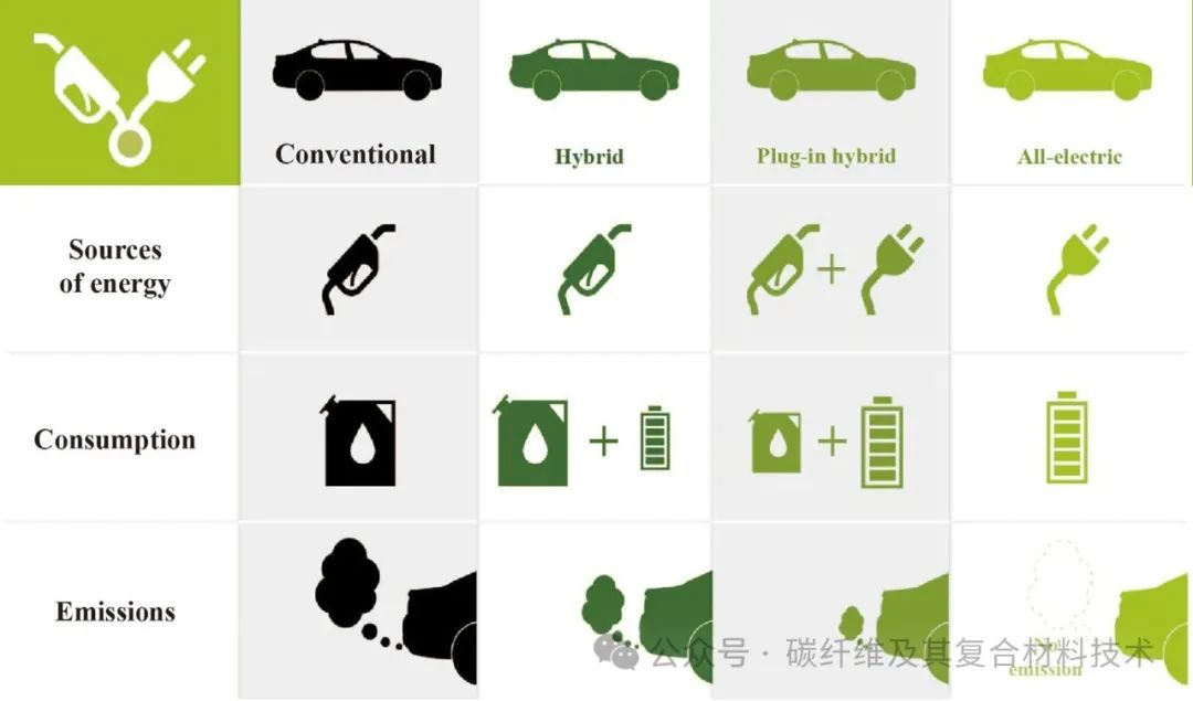 在过去的几年里,虽然车用复合材料技术得到广泛关注和研究,但是汽车行业的就业仍落后于航空航天行业。因此需要进行进一步开发和发展,来满足电动汽车日益增长的需求。下图展示了不同车型的分类。结合目前的电动汽车和汽车行业的统计数据,2020年国际乘用车电动汽车市场的估计价值约为1208.1亿美元,预计2021年至2028年间将以约32.5%的复合年增长率增长。