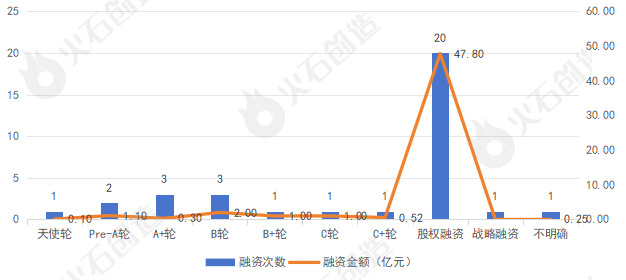 从融资阶段来看,2024年2月共20起融资为股权融资,占总数的58.82%,有5个项目集中在A轮阶段,占总数的14.7%。其中股权融资总金额最高,为47.8亿元,占总数的88.4%,B轮也获得较高融资金额,为2亿元,占总数的36.99%。