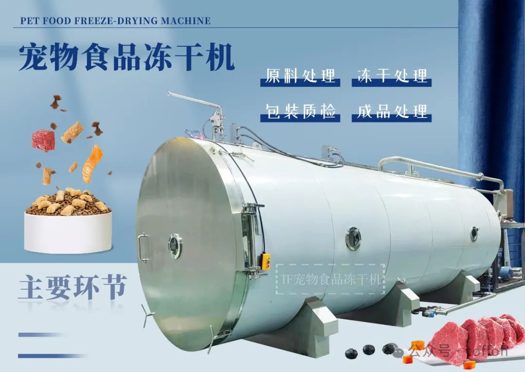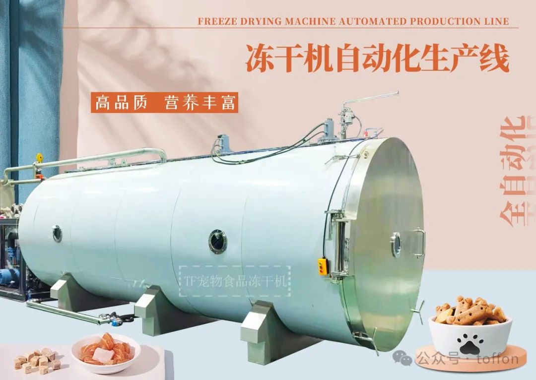 4.冻干系统:冷冻后的宠物食品进入冻干系统,在真空环境下进行冻干处理,使水分直接升华为水蒸气,从而实现食品的冻干。