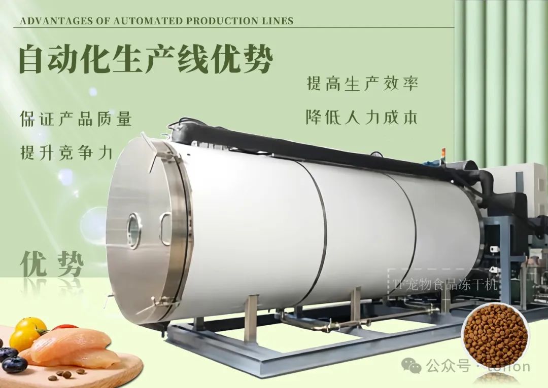 自动化宠物食品冻干机生产线通过高度自动化的生产过程,提高了宠物食品的生产效率和品质,同时减少了人工操作和生产成本。它可以适用于各类宠物食品的冻干加工,满足市场对高品质、营养丰富的宠物食品的需求。