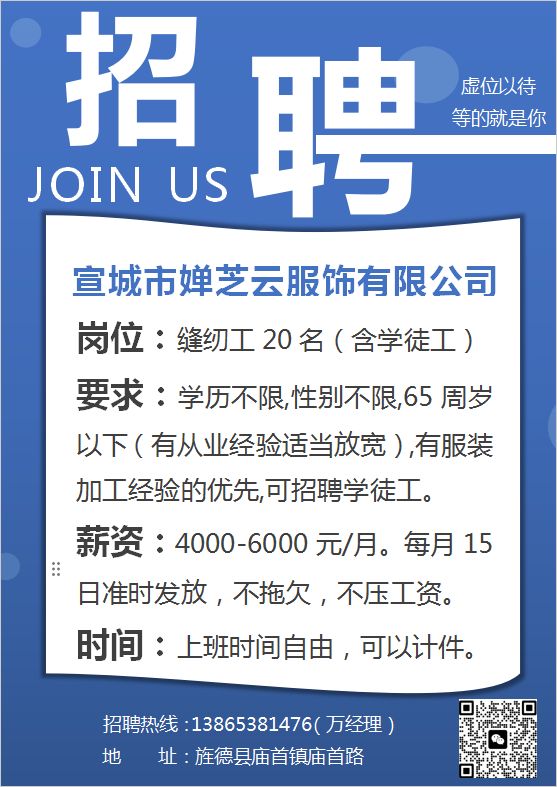 学历不限,性别不限,65周岁以下(有从业经验适当放宽),有服装加工经验的优先,可招聘学徒工.