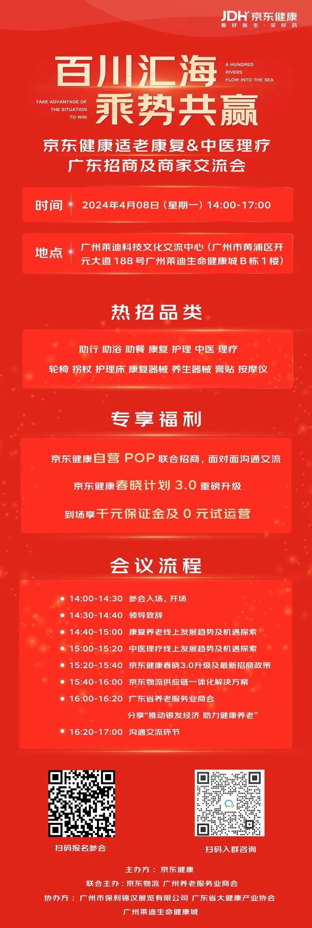 为推动数字技术赋能大健康产业,支持广东省大健康产业创新高质量发展,挖掘更多优质本地产品形成线上销售矩阵,由京东健康、京东物流、广东省养老服务业商会共同举办的“京东健康广州养老器械招商峰会”将于2024年4月8日在广州黄埔区盛大召开。