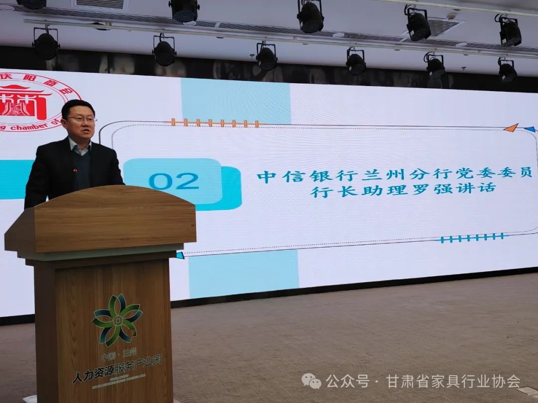 罗强讲话,他说此次战略合作协议签署,标志着双方合作进入了一个新的阶段。希望中信银行兰州分行与甘肃省家具行业协会、兰州庆阳商会充分发挥各自专业和资源优势, 实现信息互通、资源共享, 互惠共赢,努力构建双方合作发展的新平台、新机制,中信银行兰州分行将充分发挥集团协同优势和金融服务领域的专业优势,为商协会会员提供更加便捷、高效、优质的综合服务, 助力企业实现更快更好的发展。
