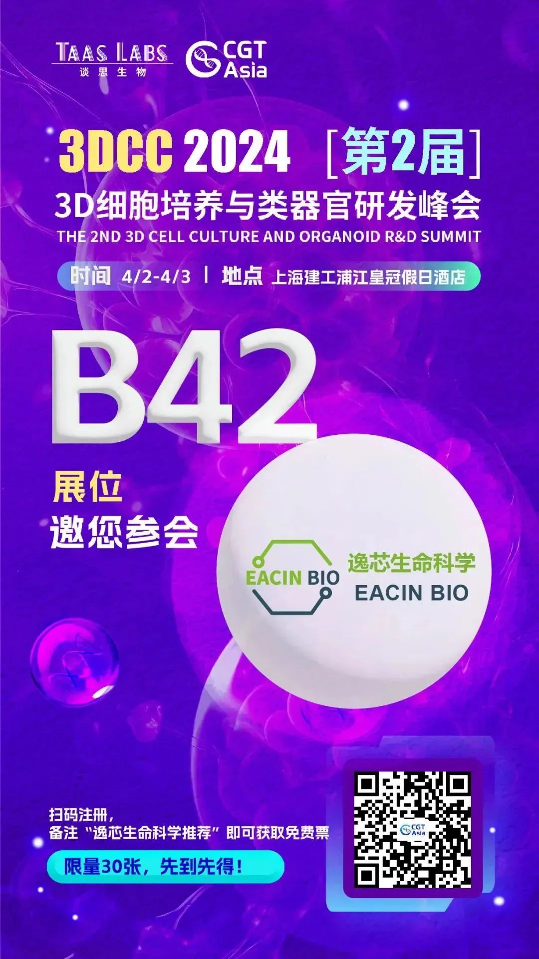 2024年4月2日-3日,由谈思生物主办,上海市生物医药产业促进中心和中国医药生物技术协会皮肤软组织修复与重建技术分会(TCMRR)作为支持单位的亚太区CGT行业标杆会议-CGT Asia 2024 第五届亚洲细胞与基因治疗创新峰会和3DCC 第二届3D细胞培养与类器官研发峰会将在上海隆重召开。