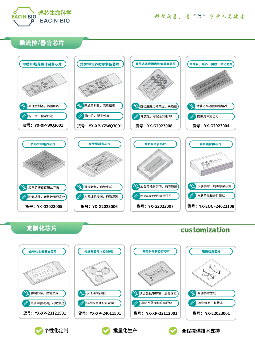 会议名称:2024 第五届亚洲细胞与基因治疗创新峰会和3DCC 第二届3D细胞培养与类器官研发峰会会议地址:上海市闵行区陈行公路3701号(上海建工浦江皇冠假日酒店宴会厅)逸芯生命科学自主研发20余种类器官培养试剂盒,满足不同种类器官的培养需求。全流程试剂盒的搭配模式有效简化实验操作流程,提高类器官培养效率和成功率。 逸芯生命科学推出的光敏材料能迅速固化,生物相容性优秀和机械强度可控等特点,广泛应用于类器官培养、3D细胞培养、生物打印、组织工程、药物载体等领域。逸芯生命科学可以为大家提供10余种的光敏系列生物材料产品,满足大家不同的应用方向和需求。逸芯生命科采取创新型工艺自主研发的Organoids基质胶来源可控、成分清晰、工艺稳定、生物安全性高、可以满足多种类器官及干细胞扩增培养、高通量类器官微球制备以及皮下成瘤等多个应用方向。逸芯生命科学自主研发近20余款通用型和特殊应用场景的标准化器官芯片模型,芯片功能稳定,能够满足用户的个性化需求,实现在类器官高通量制备、培养、建模和药物筛选中的高通量应用。 逸芯生命科学所研发的类器官高通量制备系统完全基于微流控的原理,以芯片自动化取代传统机械自动化的不足,实现类器官/3D细胞的自动化制备、收集、培养、加药和检测一体化功能。可满足多种研究方向和应用需求。在单细胞分析、药物筛选、细胞培养、再生医学、合成生物学、组织工程和高附加值微球材料合成、3D细胞培养(干细胞,类器官),水凝胶微载体,纳米药物,单细胞封装,液滴生成等方向。 逸芯生命科学期待与您相聚在展会现场,共同探索类器官领域的发展~