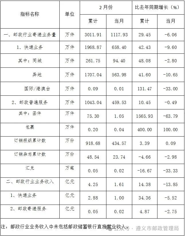 2月份,邮政行业业务收入完成1.61亿元,同比下降13.85%。其中,快递业务收入完成1.00亿元,同比下降5.52%