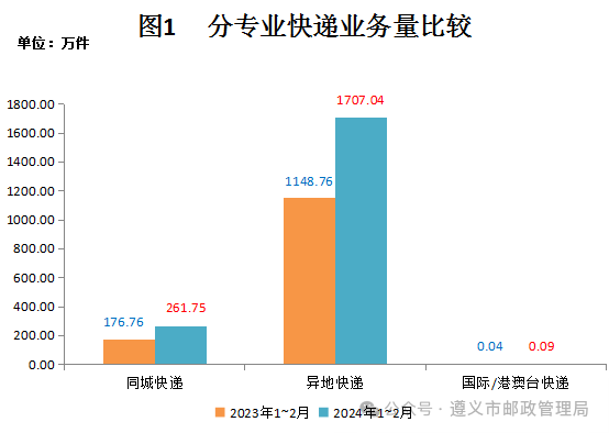 1-2月,同城快递业务量完成261.75万件,同比增长48.08%;异地业务量完成1707.04万件,同比增长41.60%;国际/港澳台业务量完成0.09万件,同比增长131.47%。
