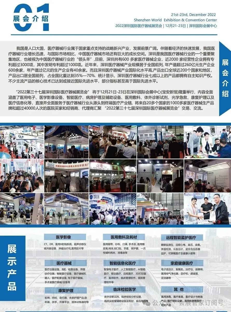 深圳国际医疗器械展览会(CMEH)是华南地区最具影响力的医疗仪器设备展览会。由中国医疗卫生行业协会、中华医学交流学会共同举办。展会内容全面涵盖了包括医用电子、医学影像设备、光学、急救、康复护理、医疗用品及卫生材料、检验设备及诊断试剂以及医疗信息技术等产品,直接并全面服务于医疗器械行业从源头到终端整条医疗产业链。