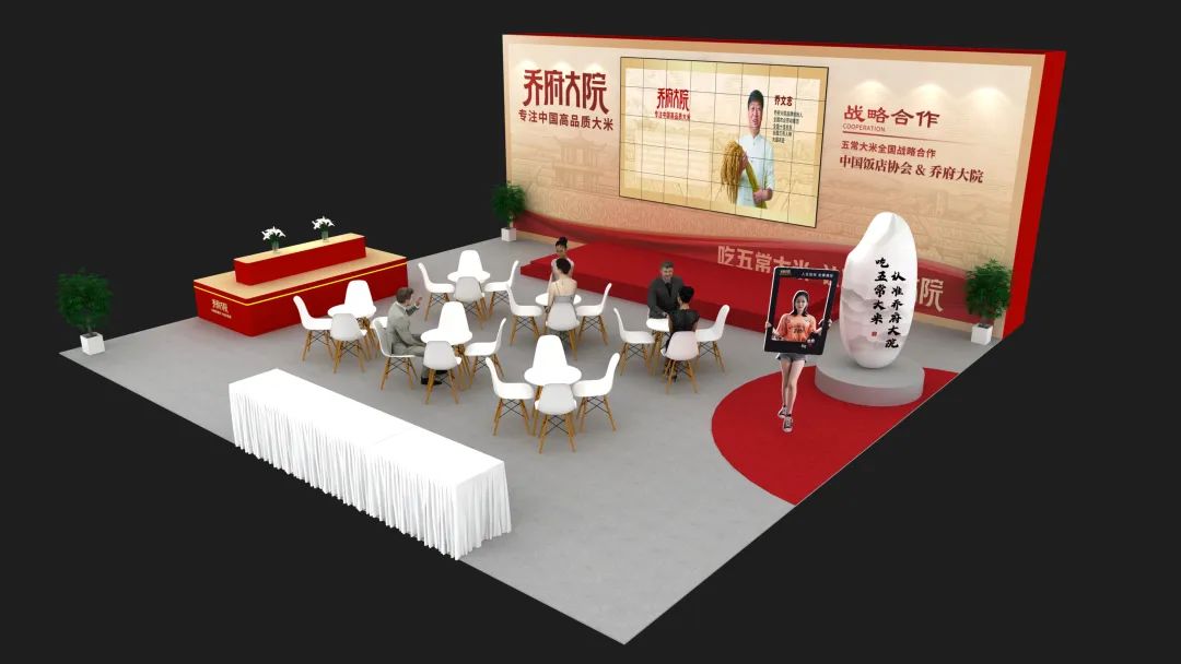 在本次良之隆展会中,绘景国际展览再次展现了其专业能力和丰富经验。不仅参与了乔府大院的展台设计搭建,还为聚宝米粉提供了同样高质量的展览策划服务。这两个展台的设计风格各异,但都体现了绘景国际展览对于细节的关注和专业度的追求。