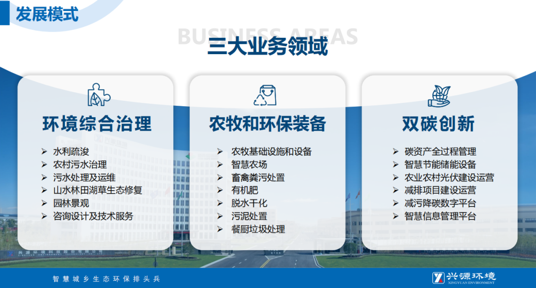 兴源环境致力于环境综合治理、农牧和环保装备、双碳创新三大业务领域协同发展,为创造美好人居环境持续贡献力量!