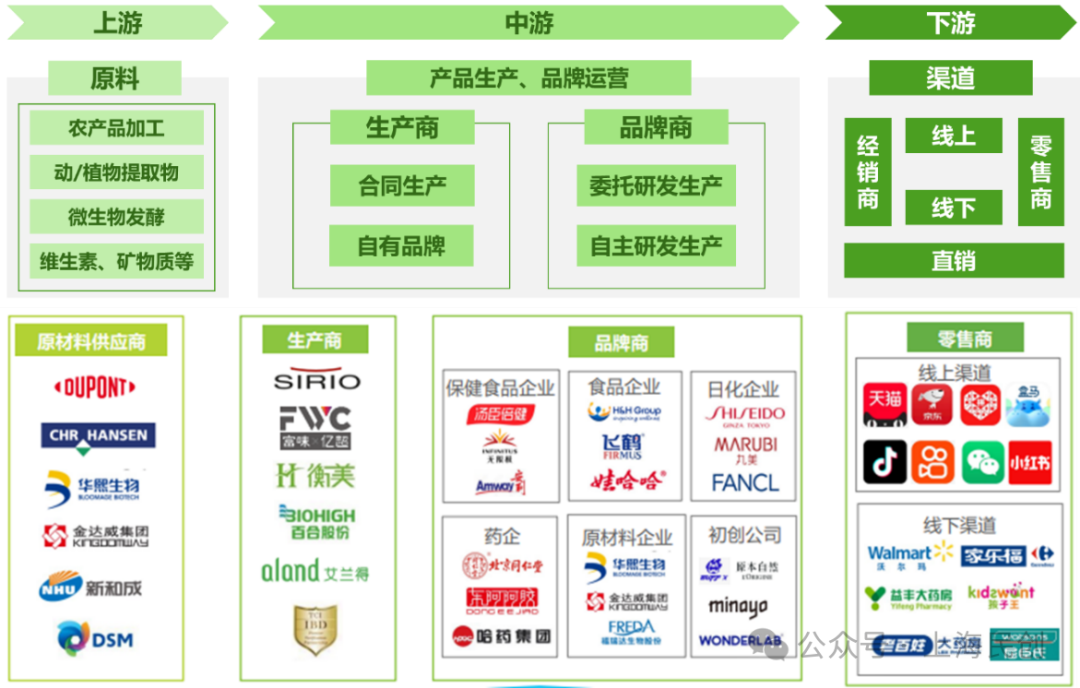 保健及功能性食品产业链主要包括上游原料供应商、中游产品生产、品牌运营商,和下游销售渠道商。保健食品及功能性食品产业链上游为原料生产供应商,包括农产品生产加工、动/植物提取物生产、维生素、矿物质原料供应、微生物发酵提取等多个领域。产业链中游集中在产品生产和品牌运营环节,主要参与者包括生产商和品牌商。产业链下游为销售端,包括经销、零售和直销以及线下门店、商超,线上电商平台等多种渠道。