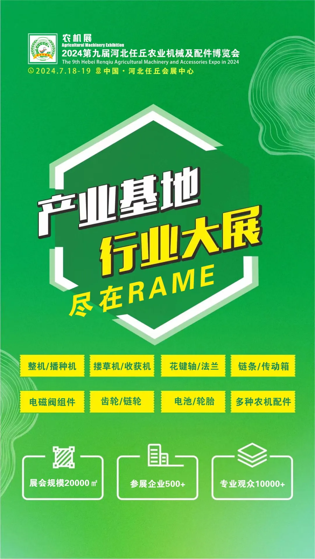 2024第九届河北任丘农业机械及配件博览会将于2024年7月18日在河北任丘会展中心盛大举办。本届展会展示面积20000平米, 参展企业700余家,专业观众10000余名此次展会空前盛大期待您的莅临!