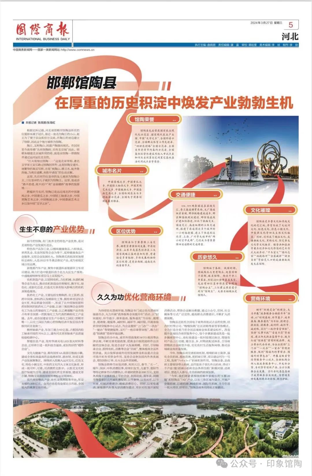 3月27日,国家商务部机关报、全球发行的《国际商报》,彩色整版宣传报道了我县《邯郸馆陶县在厚重的历史积淀中焕发产业勃勃生机》,全方位,多角度,深层次推介宣传了我县产业优势、营商环境、招商引资等各项工作亮点,这也是我县落实倪岳峰书记国际化视野招商的一大举措。