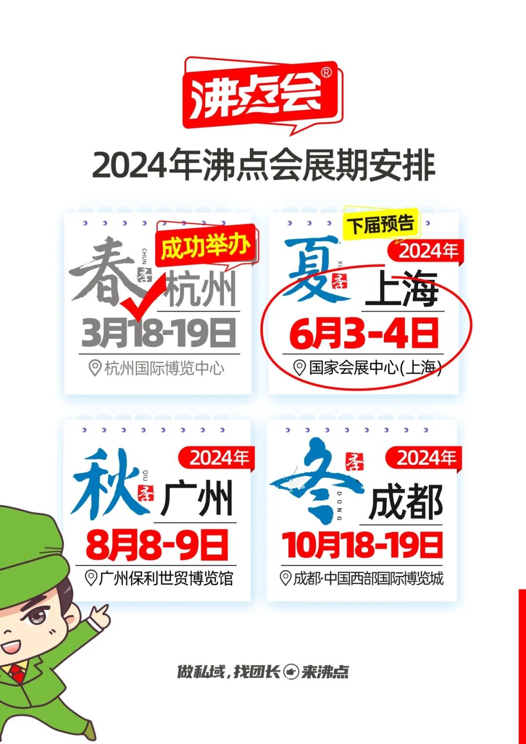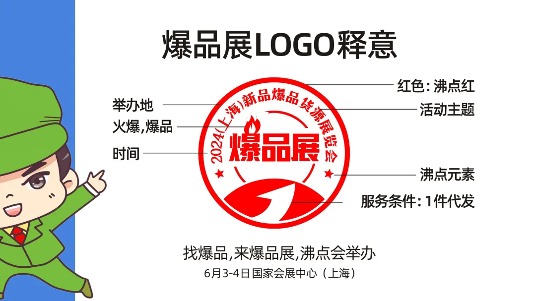 活动名上有购买理由,有详细信息,包括年度,地点,针对谁,怎样的活动等。当这个爆品展的爆字上加了一个火字时,给人的感觉是"哇塞,这也太形象了吧",对"爆"的意思有了加强。爆是文字,火是形象,双重叠加后,更是让大家感受到"爆品展"的火爆氛围。沸点的形象是小兵仔,沸点的LOGO也有五角星元素。在这个爆品展LOGO设计过程中,设计师将五角星的元素也加入到LOGO中,留下一个"沸点会"的标记。沸点会LOGO的颜色是红色,寓意火热,火爆,沸腾。所以,大家看到沸点会现场所有的宣传物料都是红色撞色,就是大家从看到趋势,到成为引领的两重天。上海沸点会已经定出去了好多展位,如果你家有夏季爆品,6月3,上海沸点会一定要来。