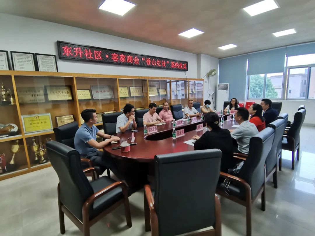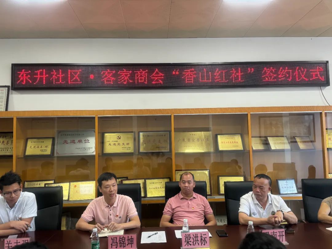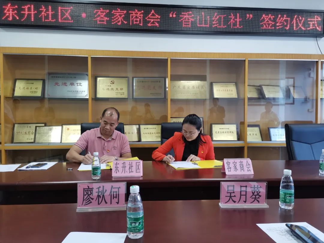 东升社区党委书记梁洪标和中山市客家商会宣传委员吴月葵共同签订“香山红社”品牌项目共建协议,标志着双方合作项目正式进入实施阶段。