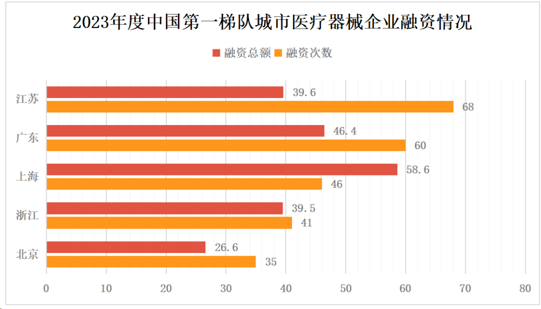 其中,根据企业注册地的分布,将城市融资能力划分为三个梯队。位于第一梯队的分别为江苏、广东、上海、浙江和北京,第二梯队包括山东、天津、四川、陕西以及安徽等十个省份,其余城市则位列第三梯队。在各个梯队中,江苏在融资企业和融资次数方面均位居首位,分别达到66家和68起;而上海企业的融资总额最高,达到58.6亿元。