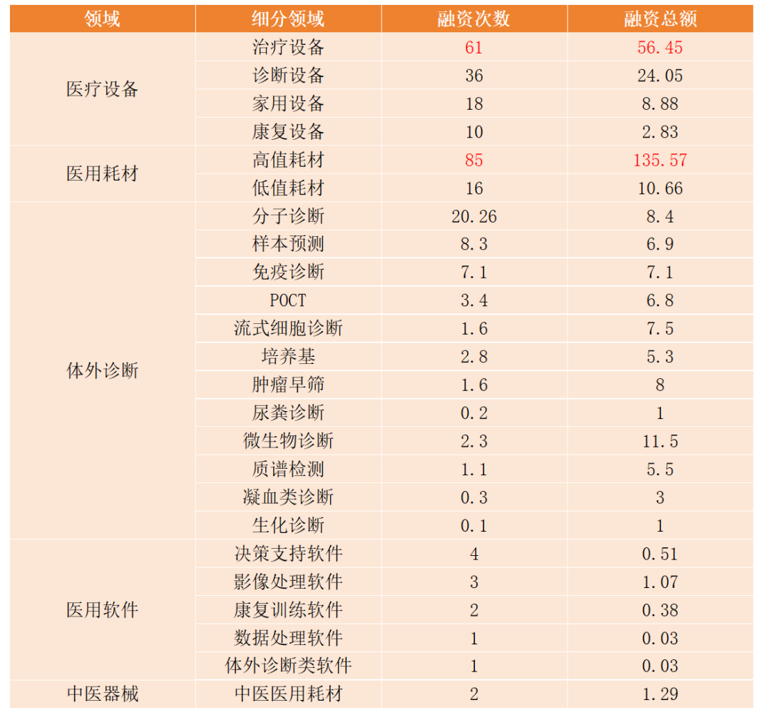 从细分领域来看,医用耗材领域里的高值耗材融资次数和融资总额均遥遥领先,融资次数高达85次,融资总额高达135.57亿元。医疗设备领域里的治疗设备次之,融资次数达61次,融资总额达56.45亿元。