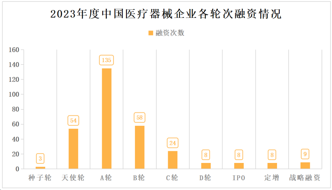 从融资轮次来看,大部分融资事件都集中在天使轮、A轮、B轮,A轮融资次数最多,达到135次,占比约44%;B轮融资次数达到58次,占比约19%;天使轮融资次数达到54次,占比约18%,合计81%。此外,国内有7家医疗器械企业成功IPO,融资总额为63.8亿元,平均融资9.1亿元。这些数据表明,医疗器械行业的投融资主要集中在早期阶段,其中A轮成为最为重要的融资阶段。