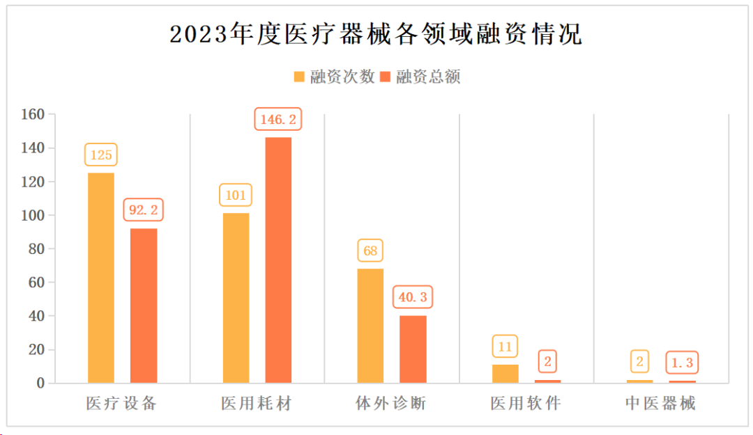 医疗器械行业主要分为五个领域,分别是医疗设备、医用耗材、体外诊断(IVD)医用软件、中医器械。其中,医疗设备领域的融资事件最多,达到125次;医用耗材领域的融资事件数量次之,达到了101次。医用耗材领域的融资总额最高,高达146.2亿元;其次是医疗设备领域的融资总额达到了92.2亿元。