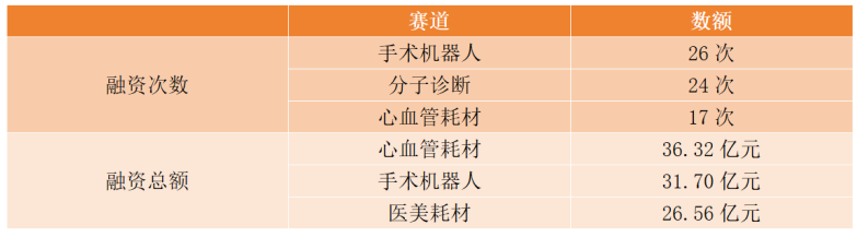 在细分赛道中,手术机器人、分子诊断以及心血管耗材领域被视为优质赛道。其中,手术机器人在融资次数中位居首位,共计26次;分子诊断紧随其后,融资次数达到24次;心血管耗材融资次数17次。心血管耗材在融资总额方面表现领先,达到36.32亿元;其次是手术机器人,融资总额高达31.7亿元;随着近年来医美的盛行,医美耗材赛道的融资总额也逐渐攀升,达到了26.56亿元。