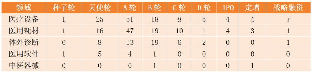 从投融资轮次分布的数据中,我们可以清晰地看到,在医疗设备领域,A轮融资占据了主导地位,其次是天使轮融资。在医用耗材领域,主要集中在A轮融资,天使轮和B轮融资的比例相对均衡。在体外诊断领域,A轮仍然占据了一定的优势,B轮紧随其后。