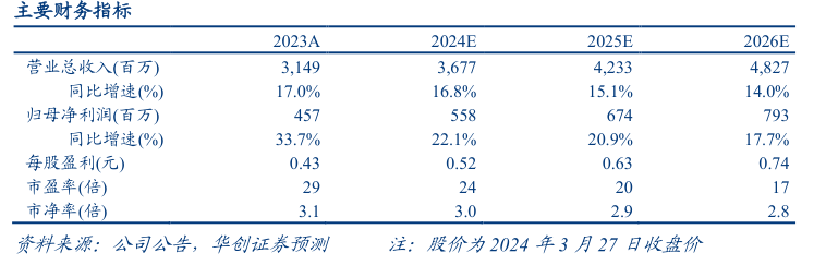 公司发布2023年年报,23全年实现营业总收入31.5亿元,同比+17.0%;归母净利润4.6亿元,同比+33.7%。单Q4实现营业总收入9.2亿元,同比+17.0%;归母净利润1.4亿元,同比+39.9%。与此前业绩快报基本一致。