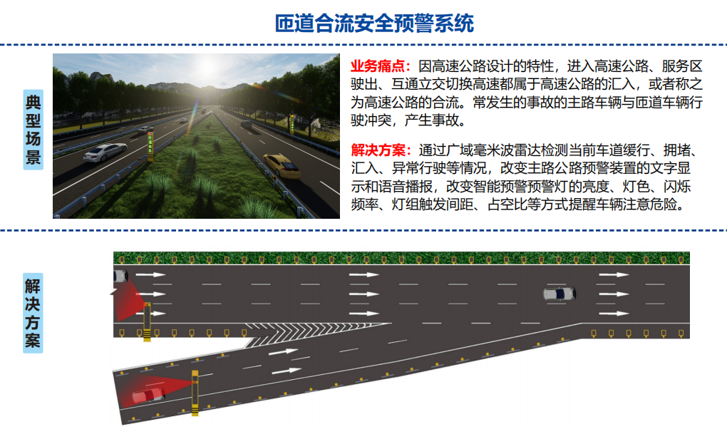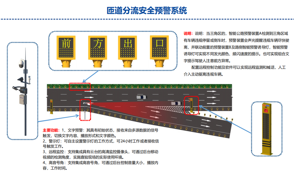高速分合流路段是交通中非常特殊的区域,车辆在此处需要频繁变换车道、调整速度,因此,对道路状况和交通流量的实时监测尤为重要。通过布设传感器、摄像头等监控设备,实时监测道路状况、交通流量等信息。一旦检测到潜在危险,预警装置会立即发出预警,提醒驾驶员注意安全。