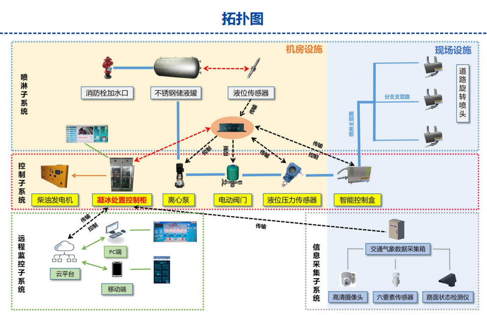 通过道路遥感传感器自动检测路面状态和相关气象信息,一旦路面温度快接近结冰临界点时,系统会自动喷洒环保型液态溶雪液,实现快速除冰融雪。该方案能够降低冰雪天气对道路交通的影响,确保行车安全。