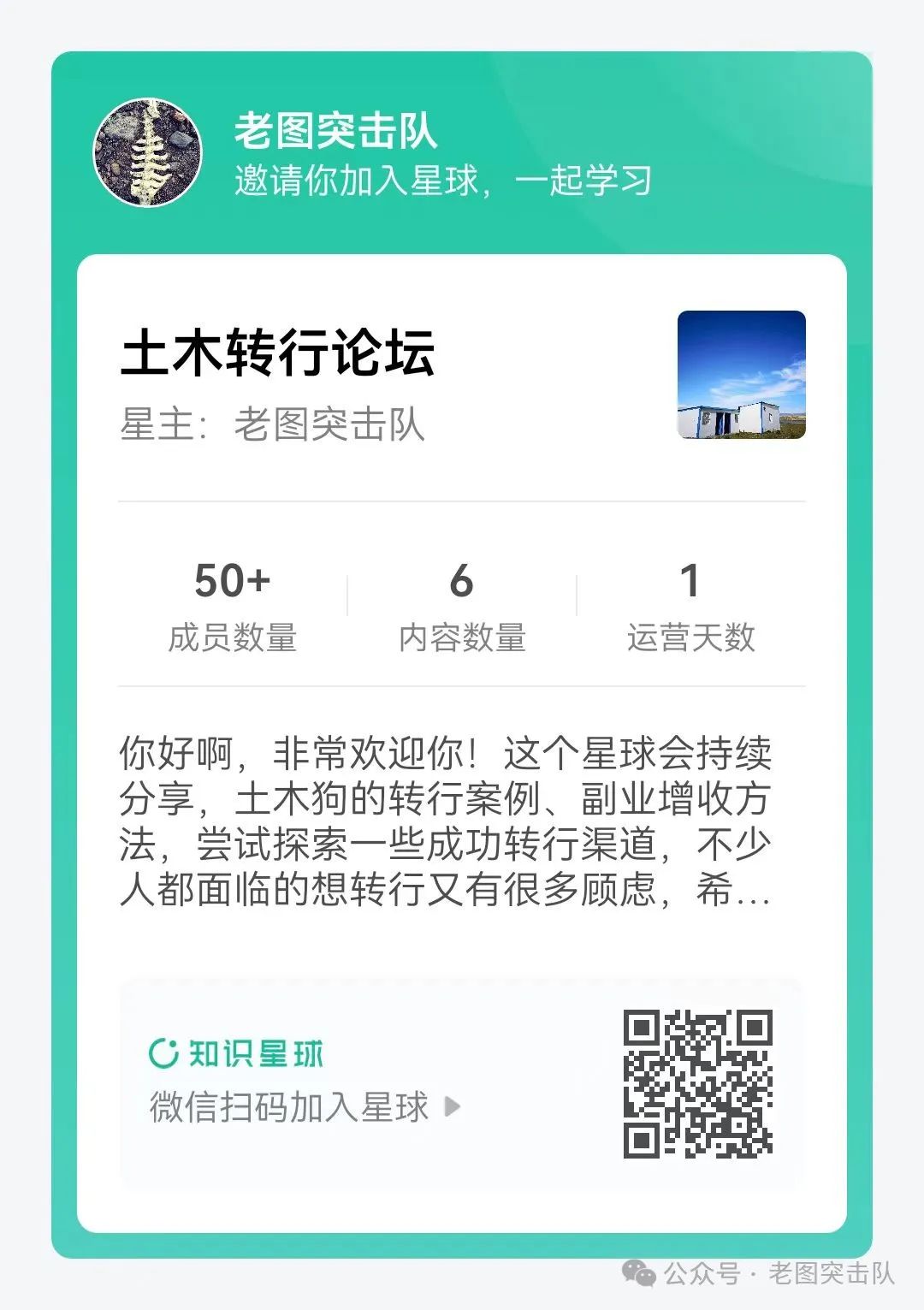 创建了个土木转行论坛,我创建的一个免费星球,希望能沉淀一些内容,帮助土木同行转行,打开眼界和路子。