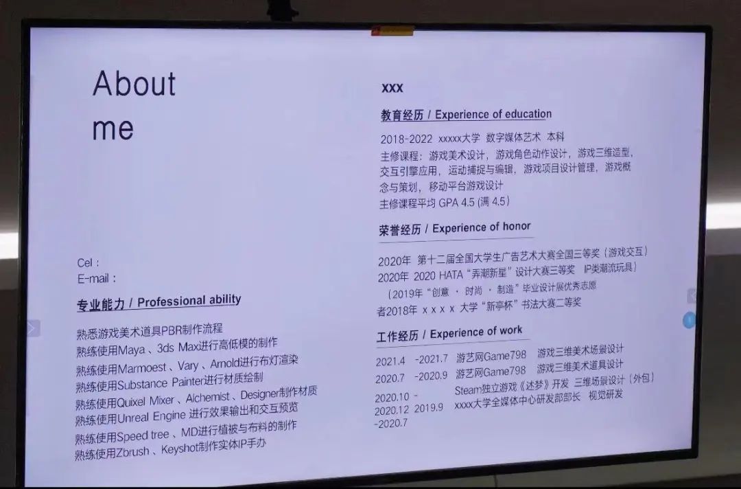 然后,后金鸽老师向我们阐述了大学生撰写简历的技巧,要有角色介绍、技能说明、相关比赛、实习内容、作品、作品观看、设计说明、艺术修养、游戏修养等。