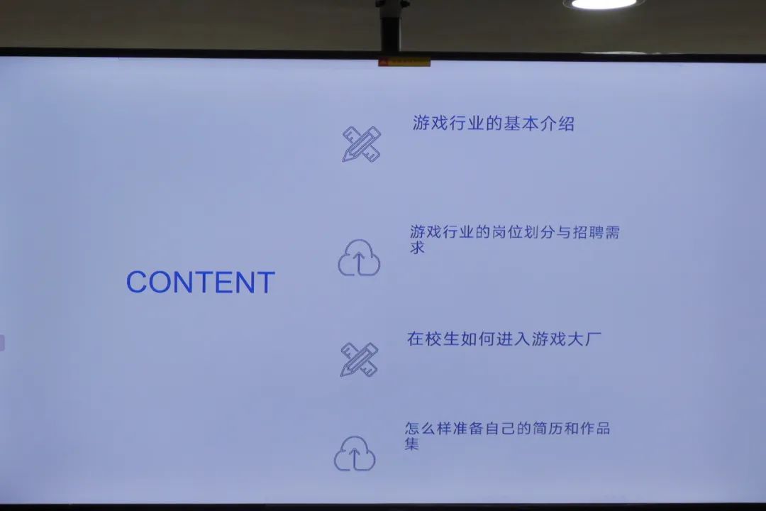 后金鸽总监将此次讲座分为四个部分,分别是游戏行业介绍,游戏行业岗位划分与招聘要求,在校招中如何准备自己的简历与作品和如何进入游戏大厂。