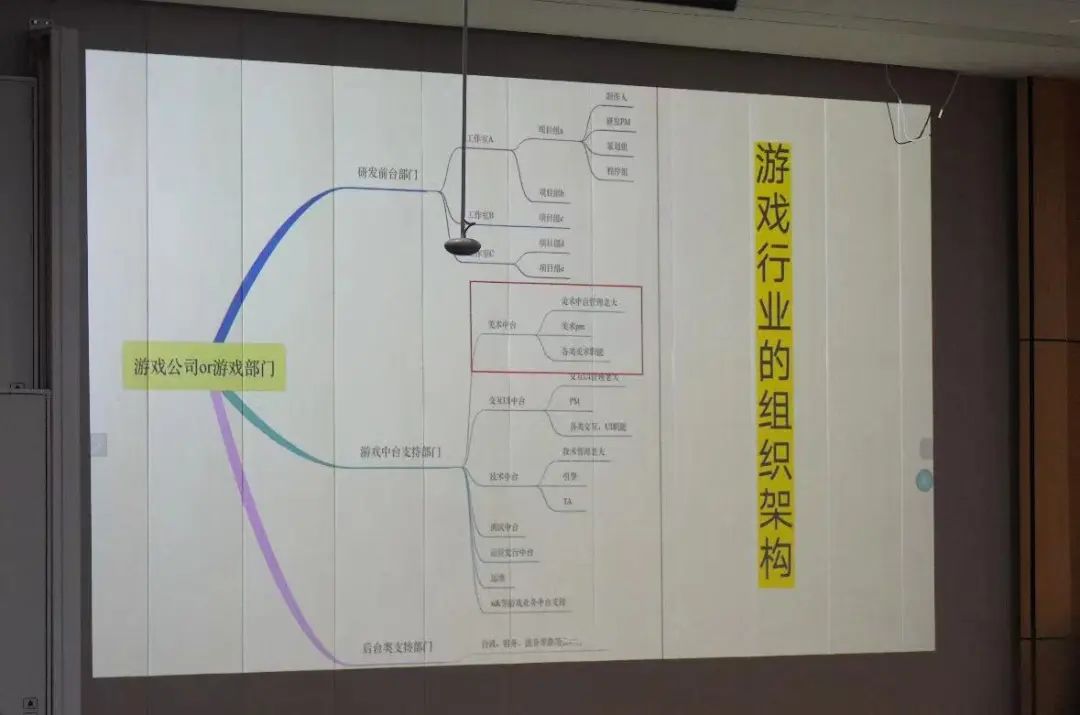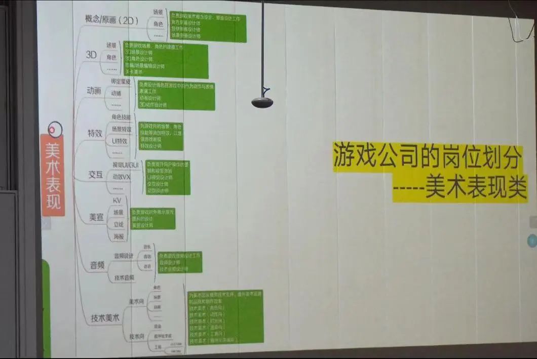 首先,后金鸽总监向我们介绍了游戏行业的组织架构,它分为研发前台部门,游戏中台支持部门,后台类支持部门。游戏公司美术表现类的岗位划分为原画、3D、动画、特效、交互、美宣、音频、技术美术等。
