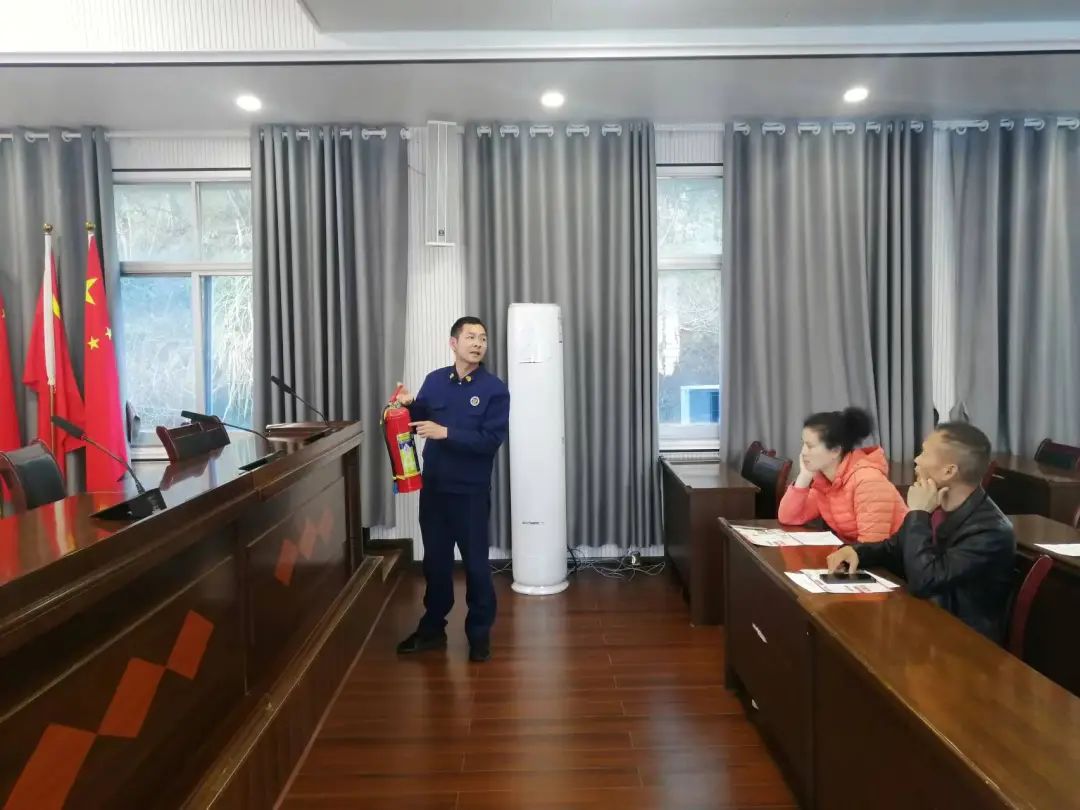培训中,九资河镇消防救援大队队员介绍了灭火器的种类、原理及适用范围,重点讲解了如何检查消防器材、灭火时的操作要领和注意事项等,并现场演示了干粉灭火器的使用方法和操作步骤。