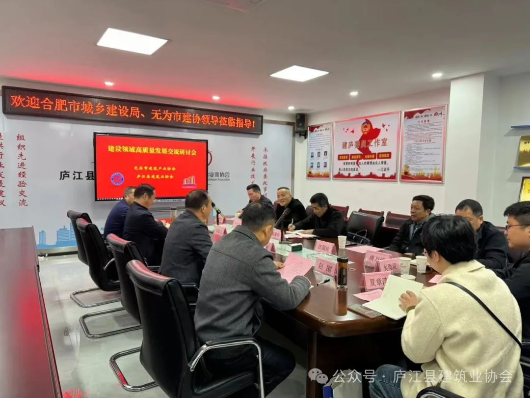 无为市建协来宾认为,庐江县建筑业协会坚持党建引领,围绕开展双向服务、反映合理诉求、开展创先评优、行业自律管理等工作,充分发挥桥梁纽带作用、体制机制和技术人才等优势,为推动县域经济社会发展做出了突出成绩,值得借鉴和学习。马发飞会长表示将增进与无为市同行的交流学习,深入推进协会间交流和互动,一起推进双方协会体制机制建设,引领行业技术创新,推动会员单位开拓创新,促进建筑行业高质量发展。