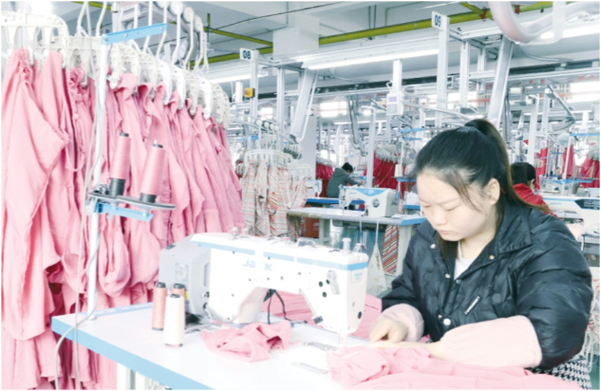 近日,在九真工业园区湖北鑫登服饰有限公司生产车间,工人正在赶制来自美国、西班牙等国际市场的订单。鑫登服饰主要从事连衣裙、婚纱等服装生产。去年,该公司投资4500万元进行技改扩规,首次实现成衣年产量突破200万件,年产值超过8000万元。今年,该公司大力拓展海外市场,订单量增加了30%,力争全年产值过亿元。