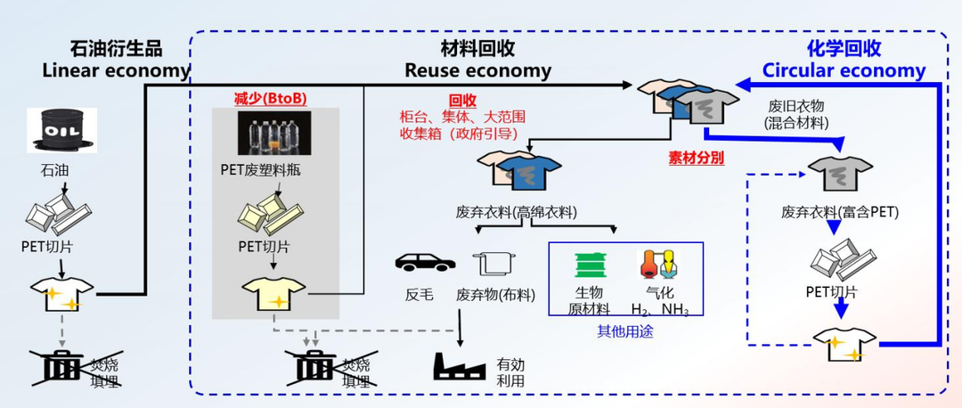 为解决纺织行业资源短缺和环境压力问题,化学纤维(尤其是PET聚酯)循环再利用的意义与产业价值引起越来越广泛的关注。考虑到目前纺织品行业消费特点,尤其是快时尚理念主导下的纺织品定位,绝大部分废旧纺织品中的聚酯成分无法通过物理法进行回收再生并实现产业闭环。目前普遍认为化学法回收再生是实现纺织行业循环发展的有效路径,即通过化学反应将聚酯纤维中的高分子链解聚,借助除杂和纯化等工艺,制备高纯度单体并重新聚合得到品质等同于原生聚酯的再生材料。化学法再生工艺可以有效去除纺丝、染整等环节带入的染料、功能性助剂等影响再生料品质的成分。