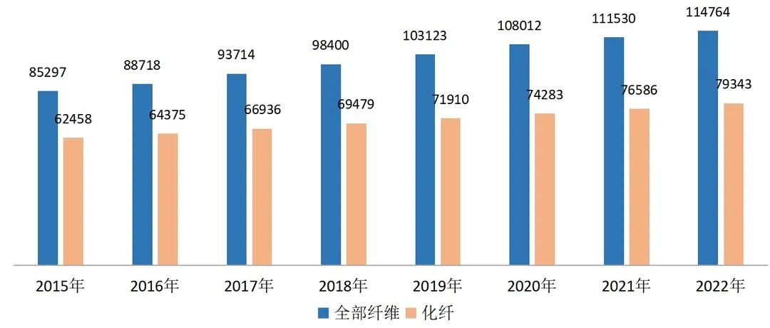 图1:2015年至2022年全球纺织纤维和化纤产量