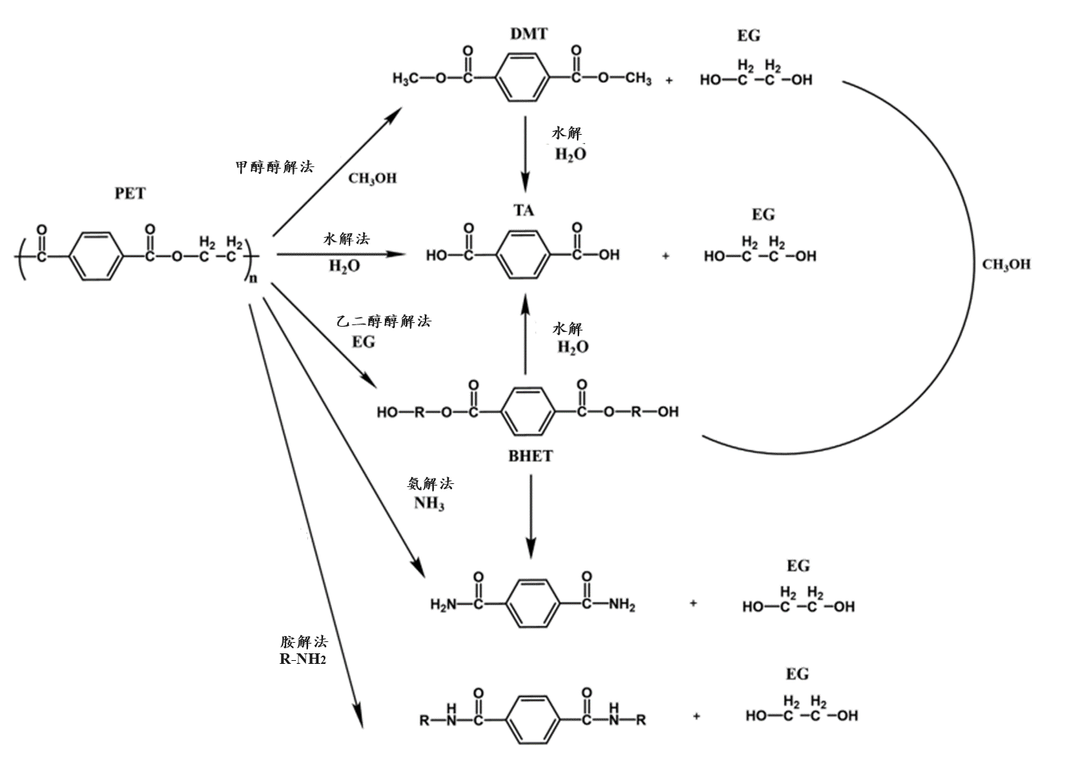 醇解法是在一定的温度和压力下,将废旧PET在醇类介质中解聚成单体。这个路线可以通过调控并优化温度、压力、催化剂等关键参数并选择合适的醇类试剂,获得不同的产物。目前甲醇醇解法运用较为广泛,但也有使用乙醇、丁醇、异辛醇等醇类试剂的报道。PET甲醇醇解法可在液体甲醇中进行,这也是最为传统的处理方式;此外还可以通过甲醇热蒸汽或者超临界甲醇为反应物对PET进行解聚处理。使用这种方法得到的单体是对苯二甲酸二甲酯(DMT)和乙二醇单体,二者均可以通过成熟的工艺装备进行提纯除杂。DMT可以水解制得PTA或直接聚合得到等同于原生料品质的再生PET。
