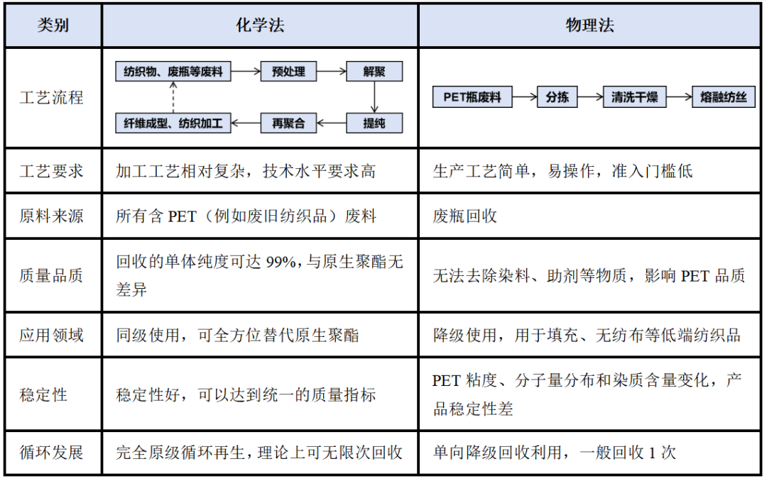 表1:PET聚酯化学法和物理法回收工艺对比