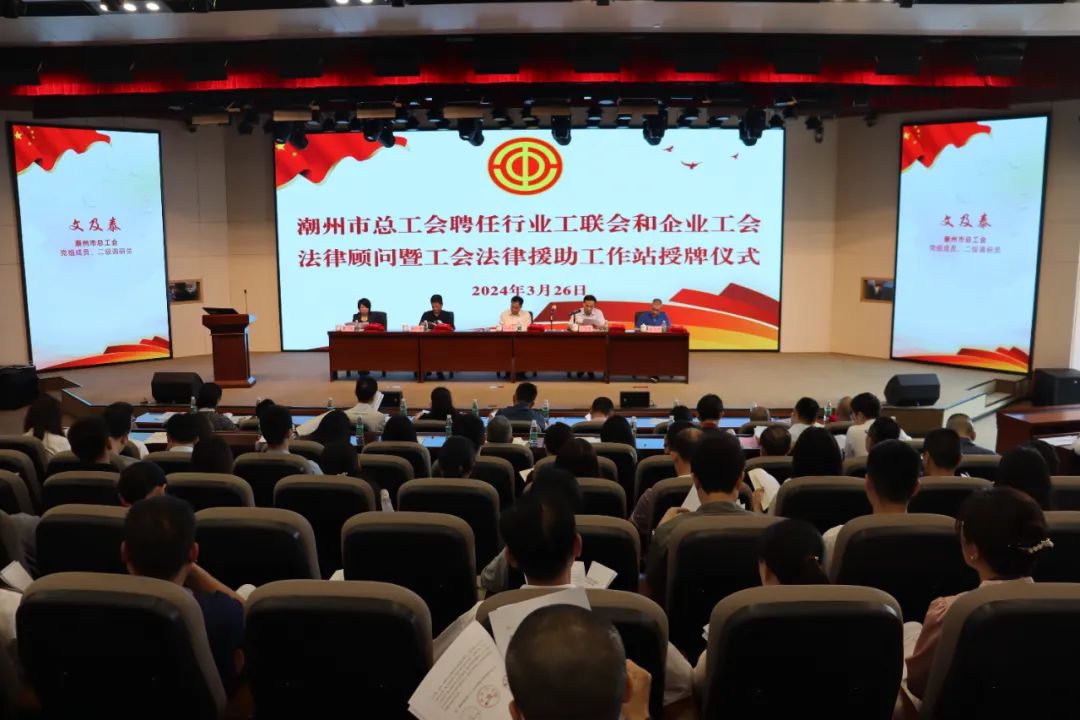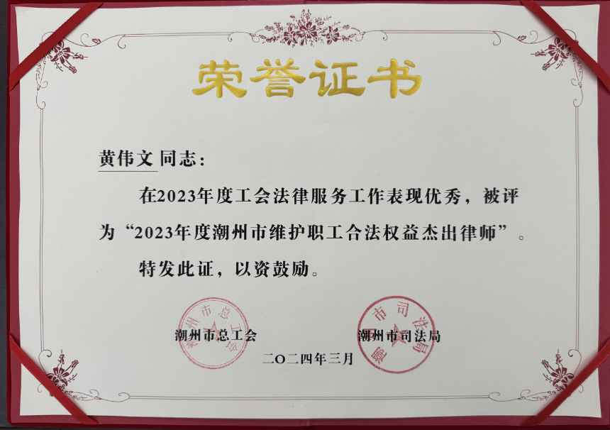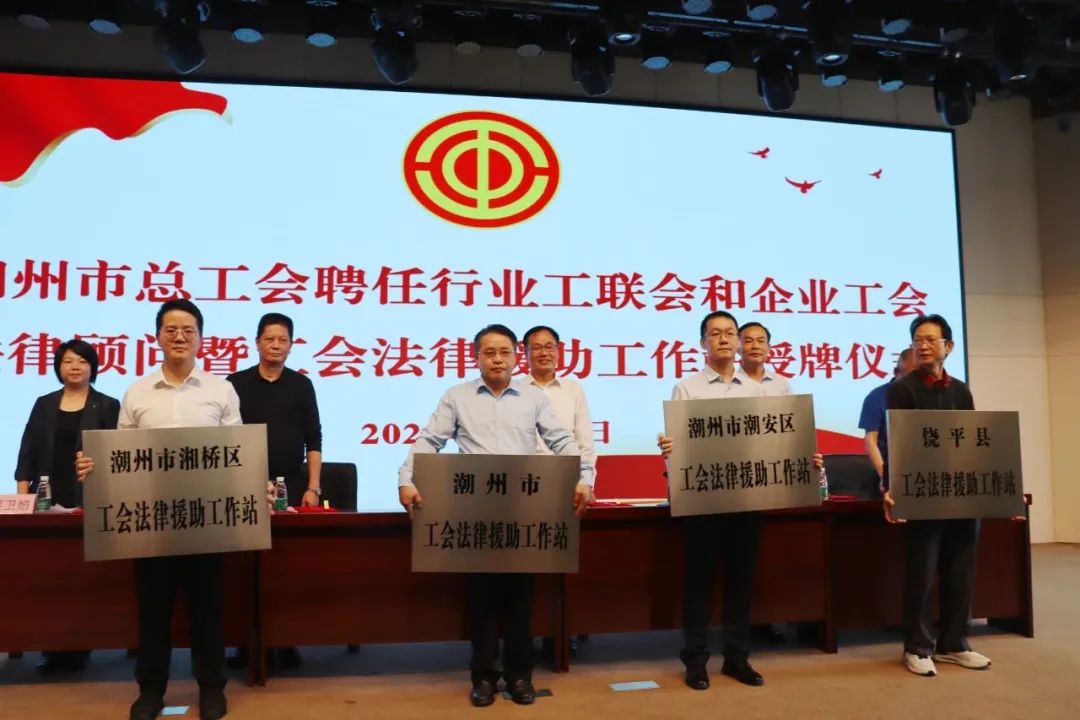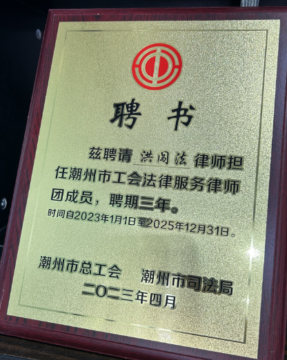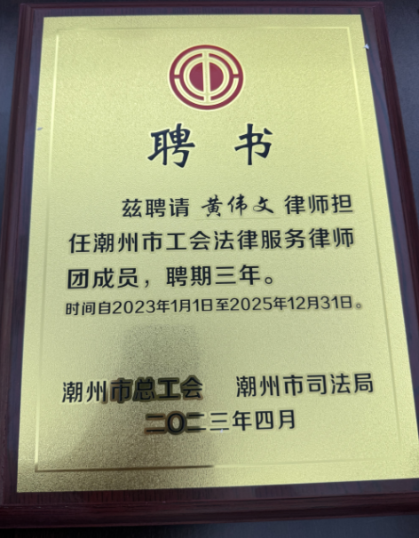 3月26日,潮州市总工会聘任35名律师为我市行业工联会、企业工会法律顾问,并成立了4个工会法律援助工作站,更好地为我市企业工会和职工群众提供法律服务,切实维护职工合法权益,构建和谐劳动关系。我所黄伟文律师和洪闯法律师受聘为行业工联会、企业工会法律顾问,聘期为一年。他们将通过主动服务、依法服务、科学服务,帮助企业工会规范运作,维护职工合法权益。此次活动还表彰黄伟文律师为2023年潮州维护职工合法权益杰出律师。