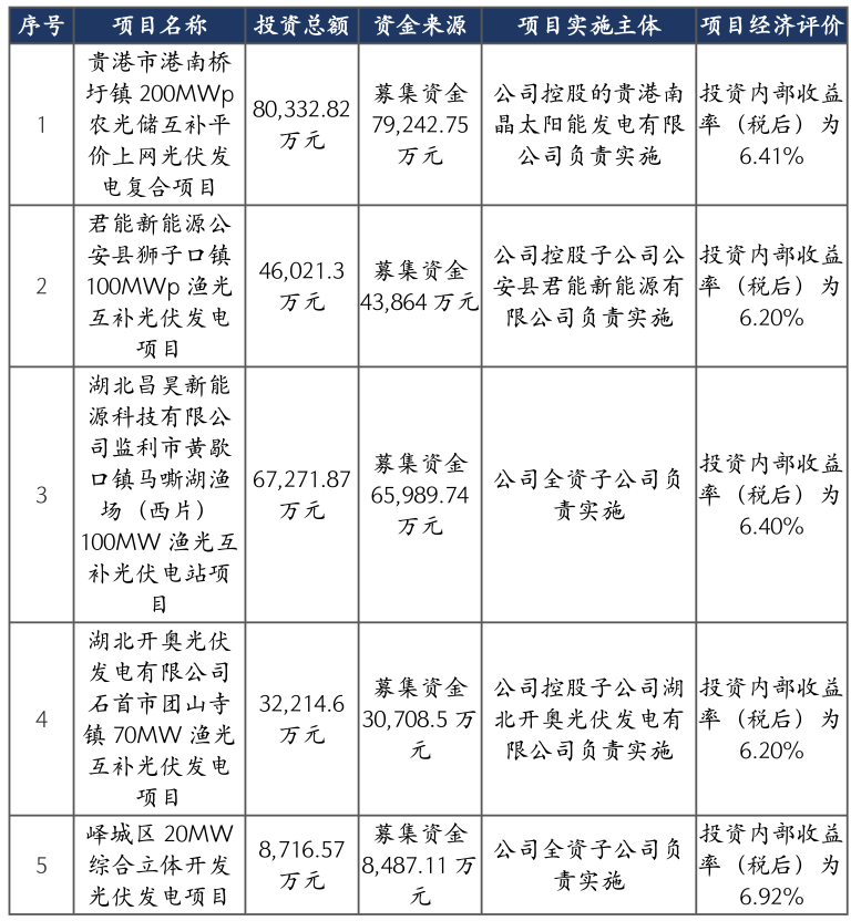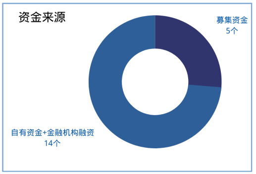 光伏电站建设资金一般为“自有资金+金融机构融资”的方式,在20个项目中,除1个项目未披露资金来源外,14个项目采用了这种方式,自有资金的比例占20%-30%,剩余70%-80%资金由项目公司通过银行贷款等金融机构融资方式取得。此外,剩余金开新能的5个项目95%以上的资金都来源于募集所得。