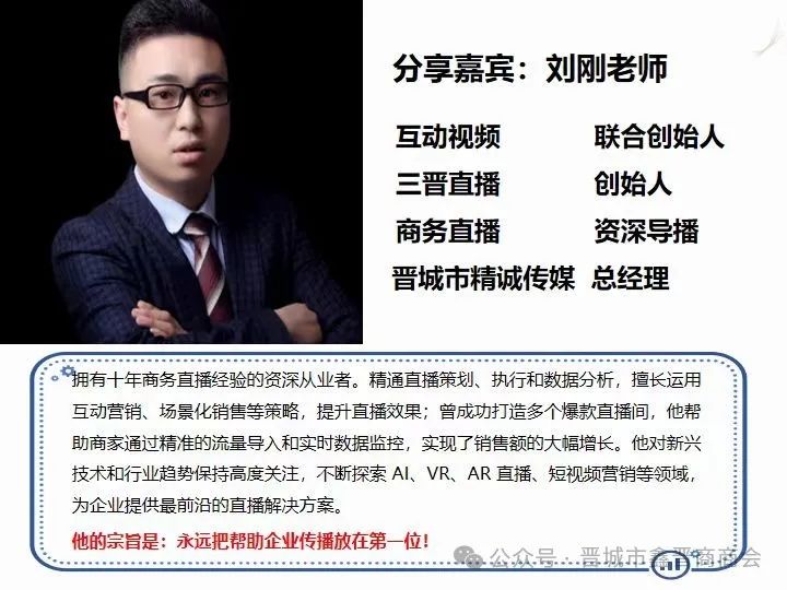 本次大讲堂特别邀请了三晋直播的刘刚老师为大家分享,刘刚老师是一位拥有十年商务直播经验的资深从业者,堪称直播界的老司机。他在这个领域积累了丰富的专业知识和实践经验,对商务直播的各种玩法和技巧了如指掌。