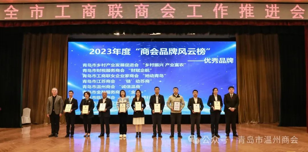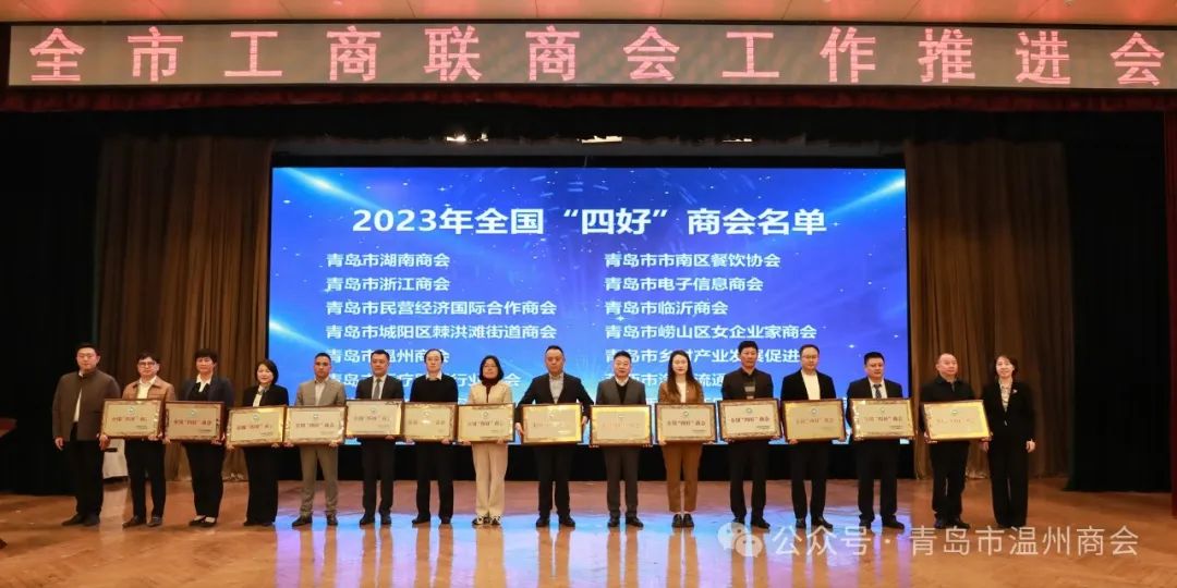 会上,为青岛市温州商会等获得2023年全国“四好”商会、2023年度优秀商会品牌、2022-2023年度全国“五好”县级工商联、2024年度首席政策官代表的先进单位和个人进行颁奖授牌。