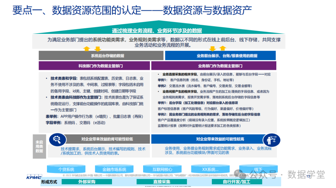 确认数据资产:企业需要梳理并确认自身的数据资源,明确哪些数据具备成为资产的条件。这包括企业内部生成的数据以及从外部获取的数据。