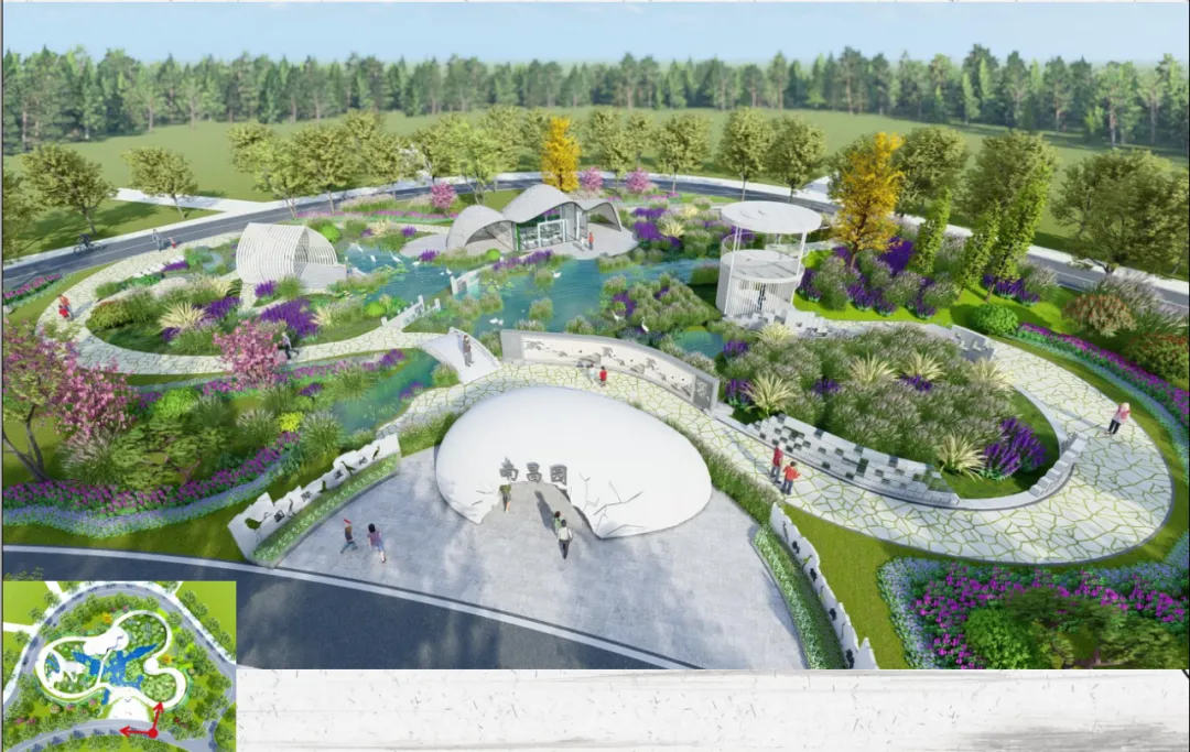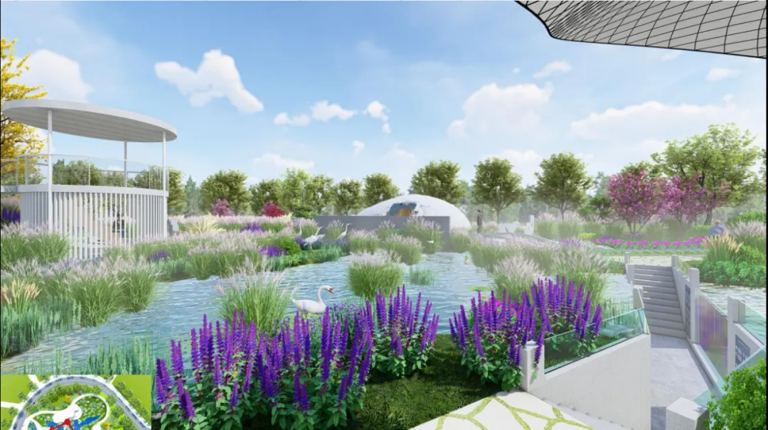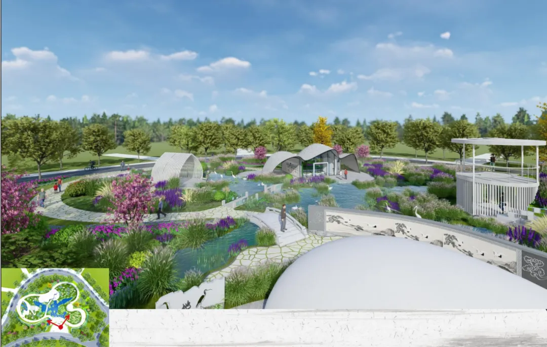 环形园路里侧绿化均种植湿地植物,水生、半水生等,打造完全的生态湿地绿化景观,绿化上设置一些白鹤小品,形态各异,灵动有趣;环形路外侧依形就势设计旱地绿化,打造春观花、秋观叶、夏浓荫、冬苍翠的绿化景观。