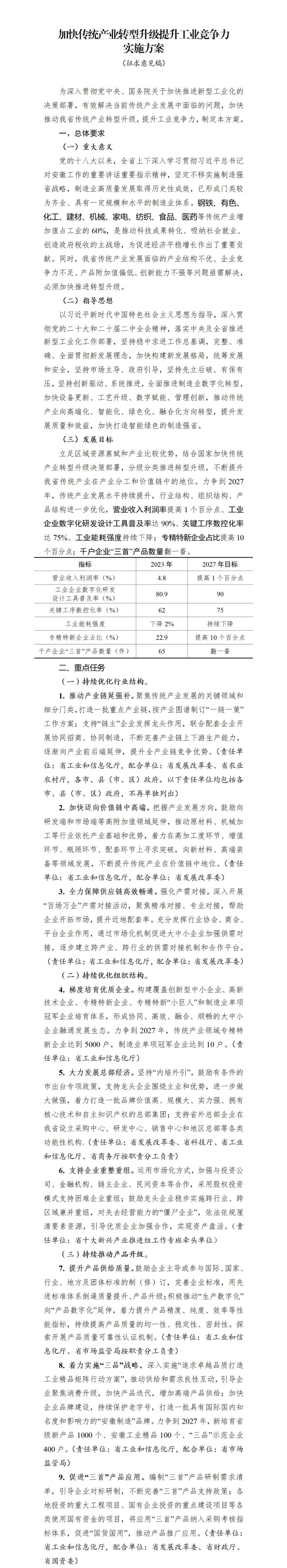 为深入贯彻党中央、国务院关于加快推进新型工业化的决策部署,有效解决当前传统产业发展中面临的问题,加快推动我省传统产业转型升级,我们起草了安徽省《加快传统产业转型升级提升工业竞争力实施方案》(征求意见稿),根据《安徽省行政规范性文件管理办法》要求,现向社会公开征求意见。为加快推动政策落地见效,如有意见或建议,请于2024年4月11日前通过书面或电子邮件进行反馈。