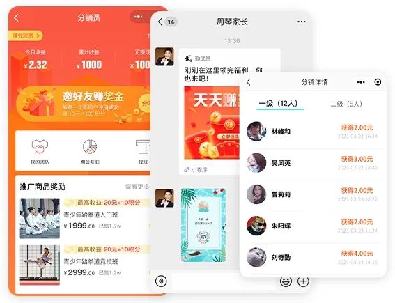 学生家长推荐亲朋好友、小孩同学,轻松实现资源变现。不同业务类型机构相互引流,资源共享,实现互利共赢。推荐奖励丰厚,一级、二级奖励双重激励,拉新及消费奖励均可设置。活动海报、课程链接一键分享至微信,推存关系自动识别,自动分佣,轻松推广无负担。